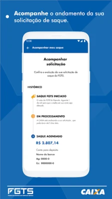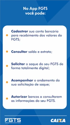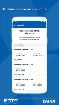 FGTS ایپ آپ کے FGTS اکاؤنٹس کی آسان نگرانی، بیلنس چیک اور آجر کے ڈپازٹس کی تصدیق کے لیے ہے۔ سادگی، رفتار اور مکمل سیکیورٹی کے ساتھ اپنے تمام قانونی نکالنے کی درخواستیں براہ راست ایپ سے کریں۔